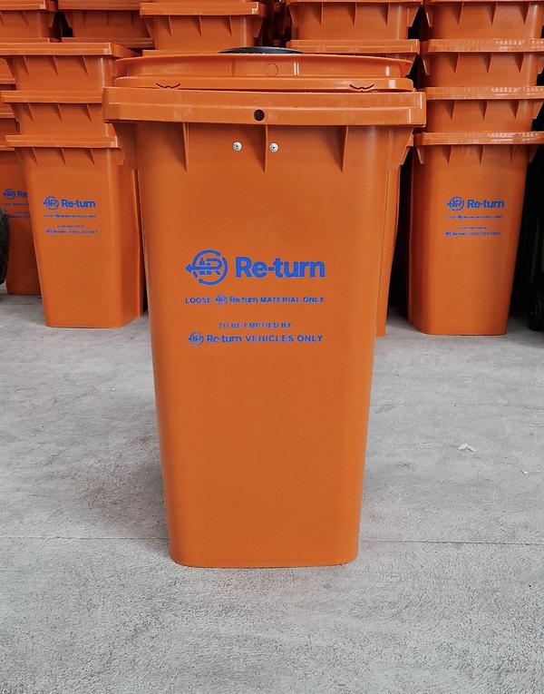 How They Work: The new orange bins are specifically for empty plastic bottles and cans with the Re-turn logo. Please continue using the red bins for all other waste.